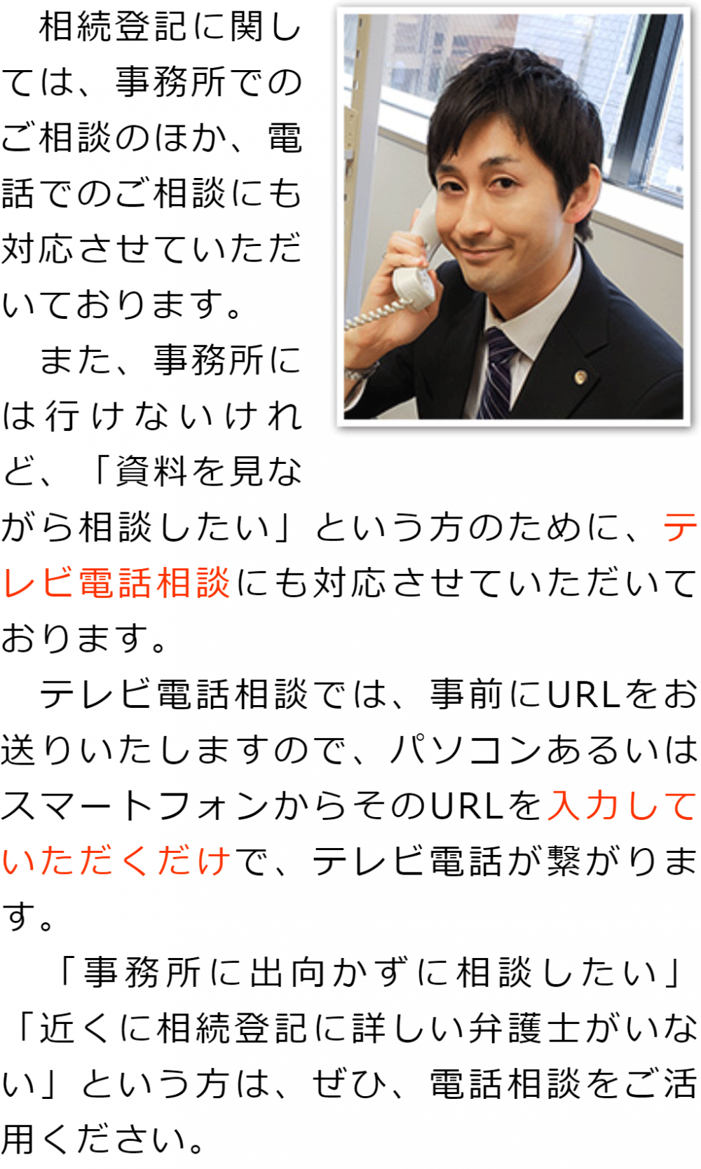トップその他電話・テレビ電話相談について 階層構造▼ その他(目次) 電話・テレビ電話相談について その他(目次)その他トップ共通バナー元※削除不可新着情報(心グループニュース)電話・テレビ電話相談について代表メッセージお客様相談室費用(詳細)費用の安さにこだわる理由関連リンクお役立ちリンクプライバシーポリシー 受付時間 平日 9時~21時、土日祝 9時~18時 夜間・土日祝の相談も対応します (要予約) 所在地 〒111-1111 ●町●●建物● 0120-41-2403 お問合せ・アクセス・地図