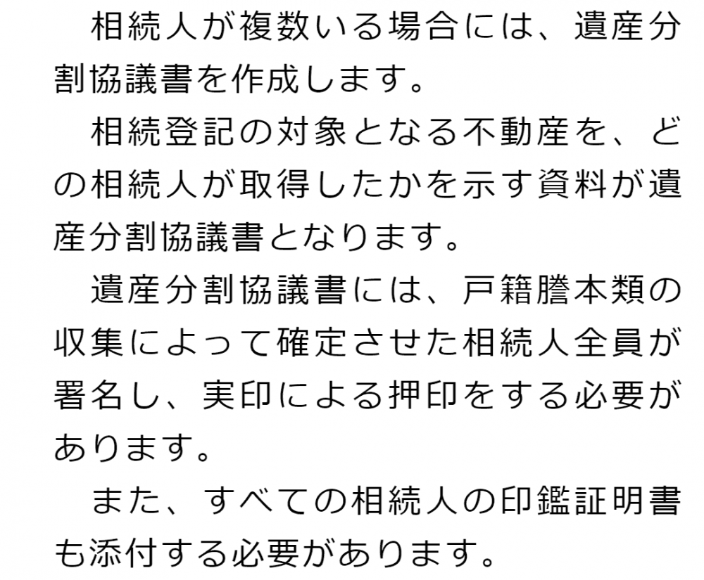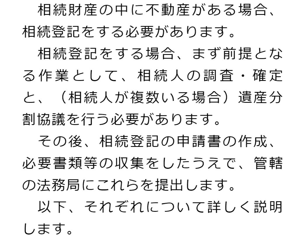 相続登記の手続きの流れ1 相続登記の手続きの流れ2 相続人の調査・確定3 遺産分割協議書の作成4 相続登記の申請書の作成、必要書類等の収集5 管轄の法務局へ書類提出 1 相続登記の手続きの流れ2 相続人の調査・確定3 遺産分割協議書の作成4 相続登記の申請書の作成、必要書類等の収集5 管轄の法務局へ書類提出